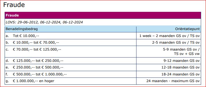 Zo zijn enkele zaken uit onze praktijk bekend waarin een maximale taakstraf van 240 uur werd opgelegd, terwijl het nadeelbedrag van de fraude in kwestie tussen de € 125.000 en € 250.000 lag. Volgens de LOVS-richtlijn zou daar eigenlijk een onvoorwaardelijke gevangenisstraf van 9 tot 12 maanden tegenover moeten staan.