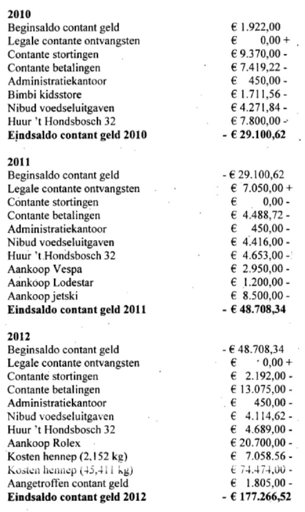 In 2006 heeft veroordeelde een geldbedrag van € 28.462,50 contant opgenomen. Hiervan werd € 4.300,- in Spanje gepind. De commerciële winst in 2006 bedroeg € 36.476,-.