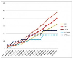 Het onderstaande grafiekje laat verder zien dat de strafeis, zoals deze volgens de nieuwe witwasrichtlijn door het Openbaar Ministerie moet worden geformuleerd, met name in de omvangrijkere witwaszaken veel hoger uitvalt dan rechters op basis van hun richtlijnen kunnen opleggen. Zeker indien als uitgangspunt moet worden genomen dat het vertrekpunt van de discussie in raadkamer moet liggen bij de minst zware bestraffing zoals deze uit de oriëntatiepunten naar voren komt[1], valt het op dat vooral bij zaken waarin een relatief groot bedrag is witgewassen, het Openbaar Ministerie op basis van de nieuwe richtlijn meer zal moeten eisen dan rechters volgens hun richtlijn zouden moeten opleggen.