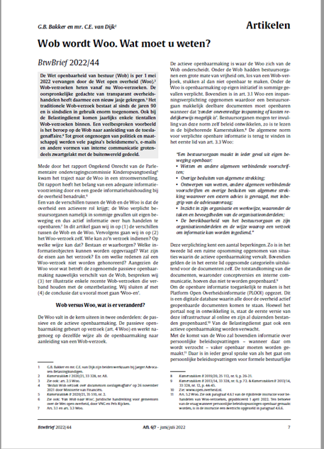 [6] Zie ook: ‘Van Wob naar Woo’, Juridische handreiking voor gemeenten over de Wet open overheid, door VNG en Pels Rijcken.